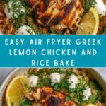 This Air Fryer Greek Lemon Chicken and Rice Bake is a flavorful and healthy one-pan meal featuring tender boneless chicken thighs marinated in lemon and herbs, cooked atop a bed of fluffy long-grain white rice with cherry tomatoes and kalamata olives. Finished with feta cheese and fresh parsley, this Mediterranean-inspired dish is easy to prepare and perfect for a quick dinner.