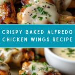 Crispy baked chicken wings coated in a rich and creamy homemade Alfredo sauce, offering a delicious twist on classic wings with a savory garlic and Parmesan flavor.