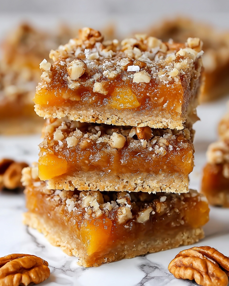 Delicious and wholesome Apricot Coconut Pecan Bars combining dried apricots, shredded coconut, and pecans, sweetened naturally with honey or maple syrup and baked to golden perfection. These bars are perfect for a nutritious snack or dessert, offering a delightful blend of chewy and crunchy textures with tropical flavors.