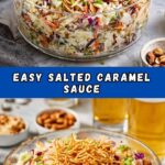 5. Serve and Garnish: When ready to serve, sprinkle chow mein noodles, sesame seeds, additional toasted almonds, and sliced green onions over the top for extra crunch and visual appeal.