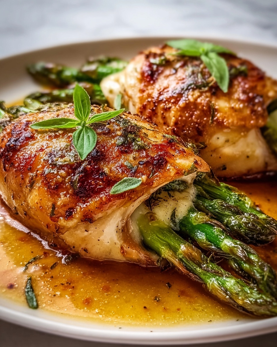To make the presentation extra special, slice the chicken breasts crosswise to reveal the colorful asparagus and melting cheese inside before plating. You can also drizzle a light garlic butter sauce on top for added moisture and flavor or serve alongside a vibrant herb-infused couscous to add another level of elegance.