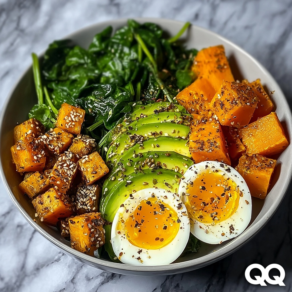 Now for the fun part: arranging your plate! Create a bed of wilted spinach, then add the golden roasted sweet potatoes and silky slices of avocado on top. Gently cut or halve those perfectly boiled eggs and nestle them amongst your other ingredients. The contrast in colors and textures here is absolutely mouthwatering.