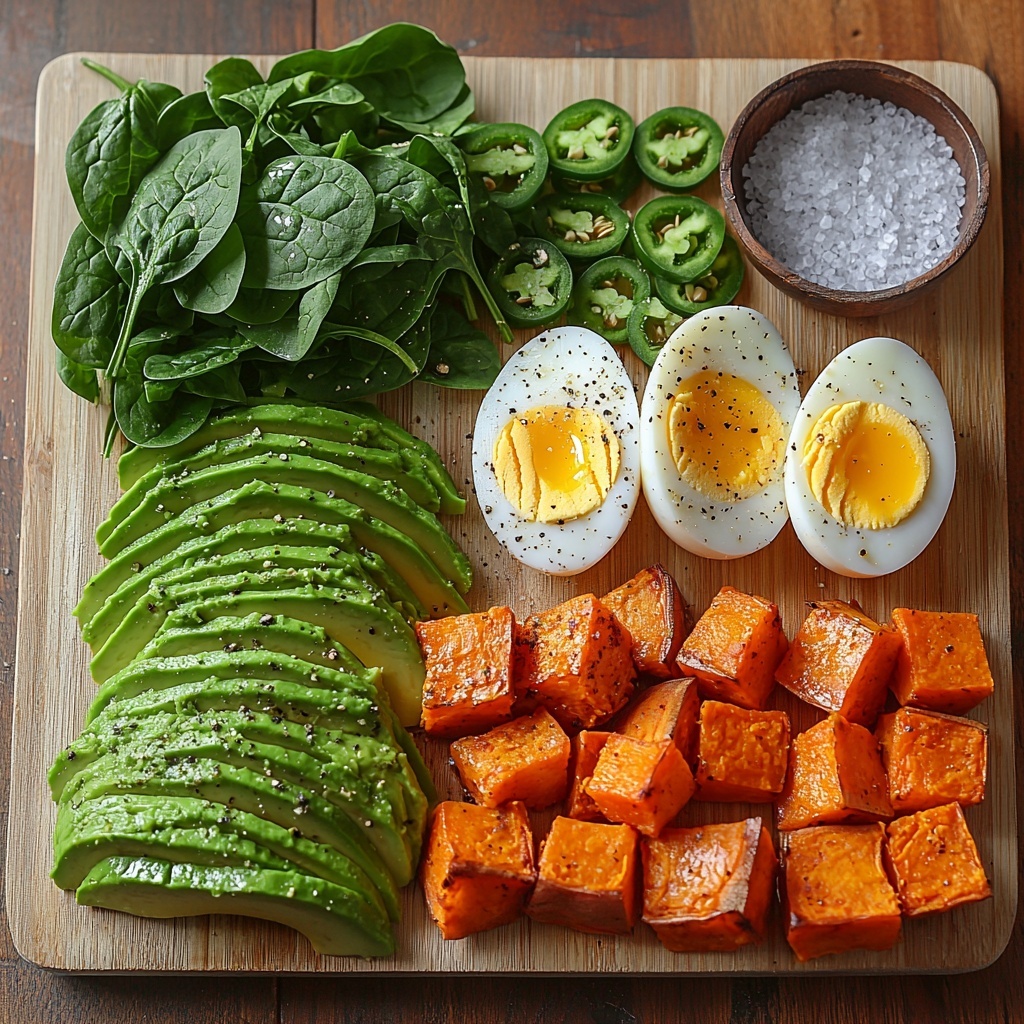 A nutritious and colorful Avocado Power Plate featuring perfectly jammy boiled eggs, roasted sweet potatoes, sautéed spinach, and tangy pickled jalapeños. This wholesome dish combines vibrant flavors and textures, making it a satisfying meal packed with healthy fats, protein, and fiber.
