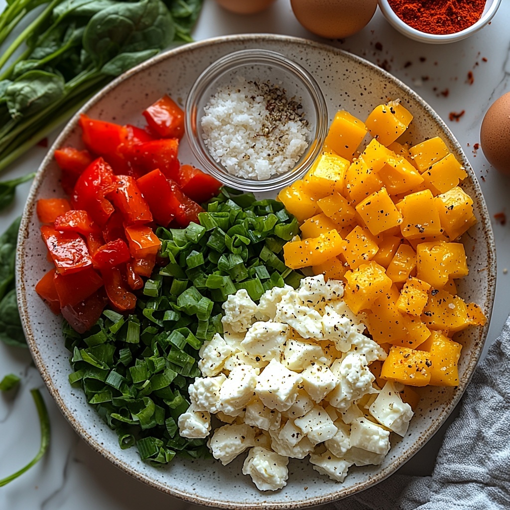 Gently incorporate the diced bell peppers and fresh spinach into the mixture. This careful folding means you keep the veggies intact, preserving their crunch and bright colors after baking. The bell peppers add sweet juiciness, while spinach brings a lovely earthiness.