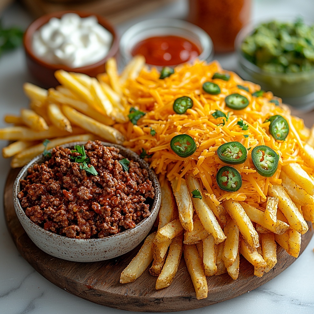 Lay your large flour tortilla flat and start layering your ingredients: a generous base of seasoned beef, a crispy pile of fries, and a generous sprinkle of both cheeses right on top. If you want, go wild with jalapeños, sour cream, or guacamole for extra layers of flavor and texture.