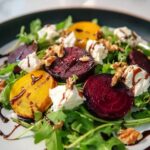 A vibrant and flavorful Beet Salad featuring roasted beets, creamy goat cheese, toasted nuts, and a tangy balsamic dressing. Perfect as a light lunch or elegant side dish, this salad combines earthy, sweet, and savory flavors with a fresh herb garnish for a delightful balance of taste and texture.