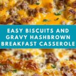 A hearty and comforting Biscuits and Gravy Hashbrown Breakfast Casserole combining savory ground sausage, crispy hashbrowns, flaky biscuits, cheese, and a savory egg mixture baked to golden perfection – perfect for a satisfying breakfast or brunch.