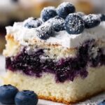 - Garnish and Serve: Garnish with additional fresh blueberries and a light dusting of powdered sugar if desired. Slice and serve immediately, or refrigerate for up to 4 hours to allow the cake to set.
