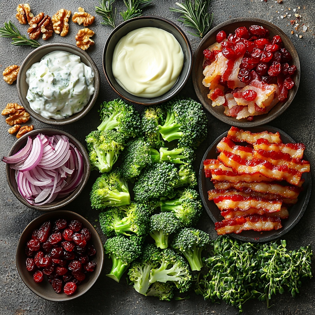 These ingredients are wonderfully simple yet essential for achieving the perfect balance in this Broccoli Bacon Salad Recipe. Each one adds a unique note, from the crispy, smoky bacon bits to the sweet crunch of cranberries and the creaminess of the dressing blending Greek yogurt and mayonnaise.