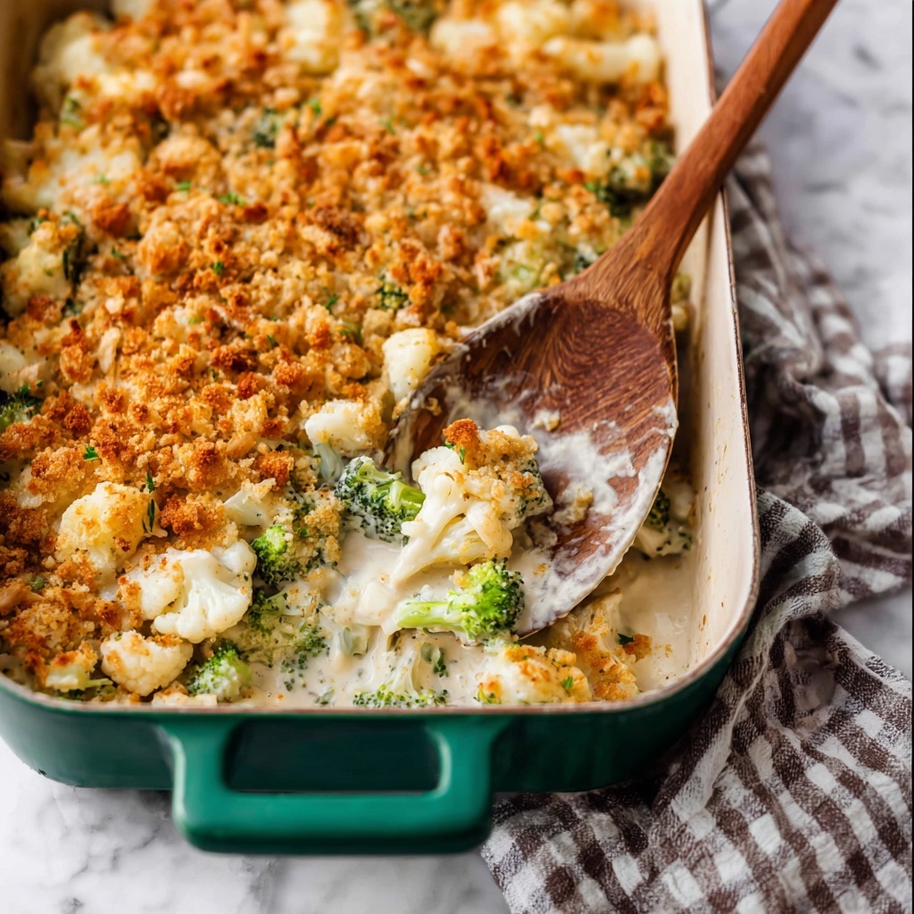 A comforting broccoli cauliflower casserole featuring tender florets coated in a rich, creamy cheese sauce, topped with homemade crispy buttered breadcrumbs and baked until golden and bubbly. Perfect as a hearty side or a vegetarian main dish.