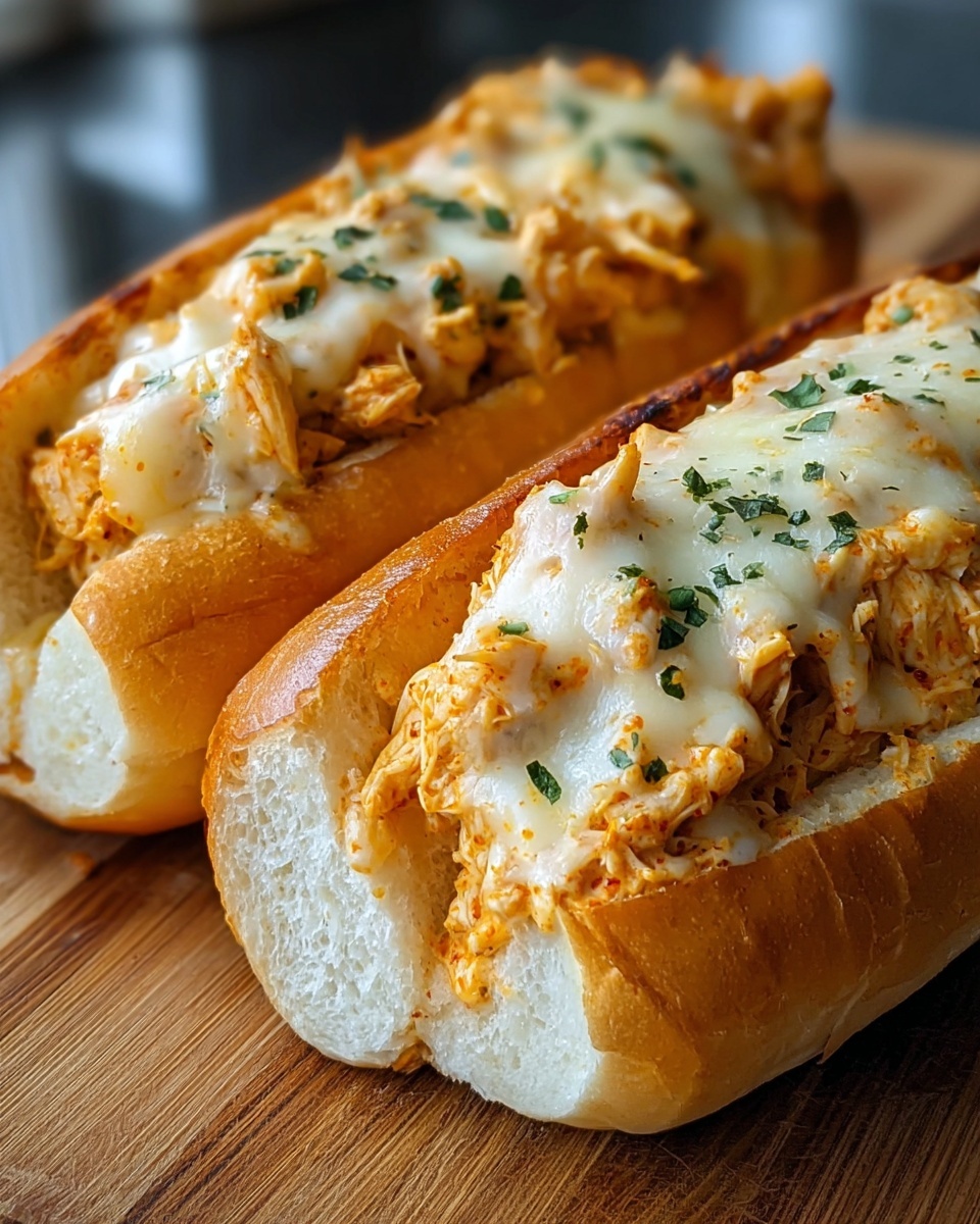 These Buffalo Chicken Stuffed Cheesy Bread Subs combine shredded chicken tossed in tangy buffalo sauce with creamy cheeses and ranch seasoning, all stuffed into buttery hoagie rolls and baked to golden perfection. A perfect spicy, cheesy comfort food for lunch or a game day snack.