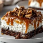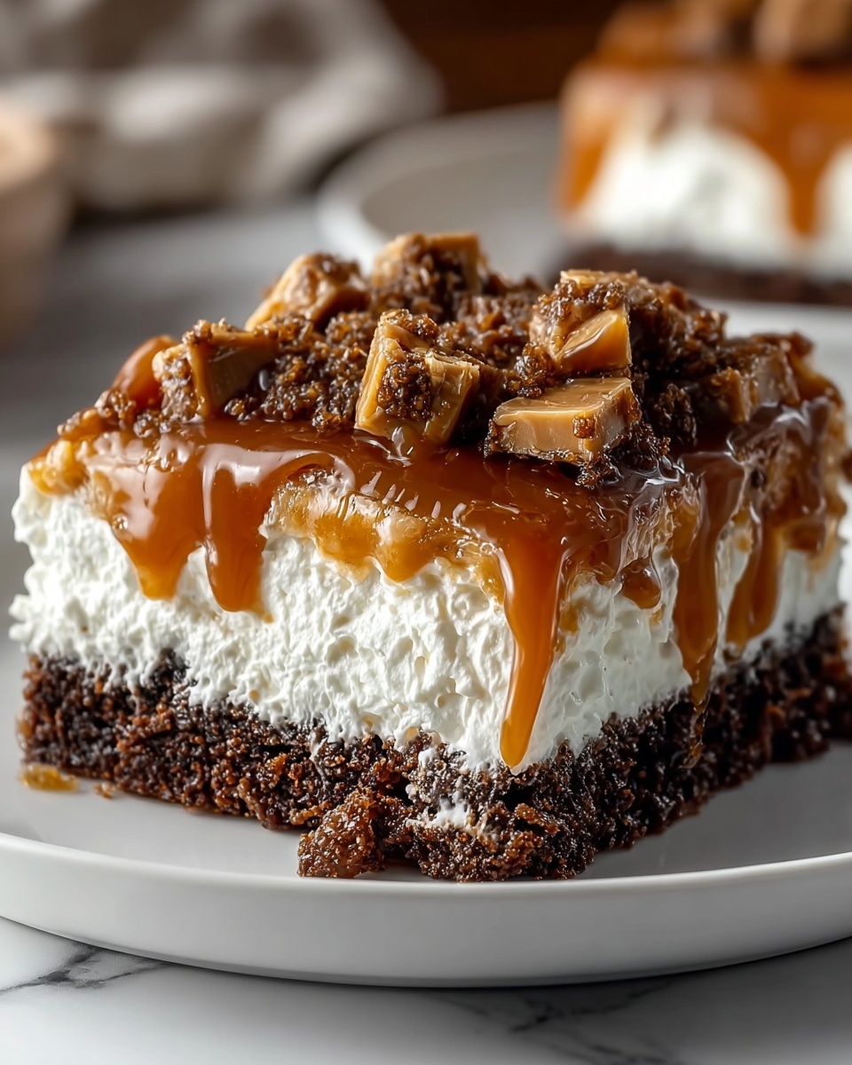 This Butterfinger Candy Bar Poke Cake is a decadent chocolate dessert featuring a moist chocolate cake infused with a rich caramel and sweetened condensed milk mixture. Topped with fluffy whipped topping and crushed Butterfinger candy bars, this cake offers a delightful combination of creamy, crunchy, and chocolaty textures, perfect for any celebration or sweet craving.