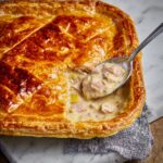 4. Assemble and bake the pie: Preheat the oven to 200°C (392°F) / 180°C (356°F) fan-forced. Lightly butter your pie dish with remaining butter. Pour the cooled filling into the dish. Cover with the puff pastry sheets, trimming any excess. Press edges to seal and create vents to allow steam to escape. Brush the top generously with beaten egg yolk for a golden crust. Bake in the preheated oven for 35-40 minutes until the pastry is puffed and golden brown. Let rest for 5 minutes before serving.