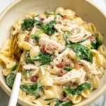 Remove the pot from heat, then fold in your shredded chicken and fresh baby spinach. Cover the pot and let it sit for 3 to 5 minutes. During this time, the spinach wilts just right and the chicken warms through without drying out. The orzo will continue to absorb the sauce, thickening it up until it’s perfectly creamy and ready to serve.