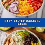 - Add the salad ingredients. Layer black beans, halved cherry tomatoes, defrosted corn, shredded cheddar cheese, salsa, sliced red onions, and sliced avocado on top of the rice and chicken mixture. Arrange ingredients evenly for each serving.