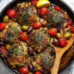 Return the browned chicken thighs to the skillet, nestling them right into the tomato mixture. Pour in the chicken broth, then scatter in the green olives and rinsed capers for that classic salty pop. Add a pinch more herbes de Provence to intensify the herbaceous notes. Bring everything to a gentle simmer, cover the skillet, and cook for about 25 to 30 minutes until the chicken is tender, cooked through, and infused with all the vibrant flavors.