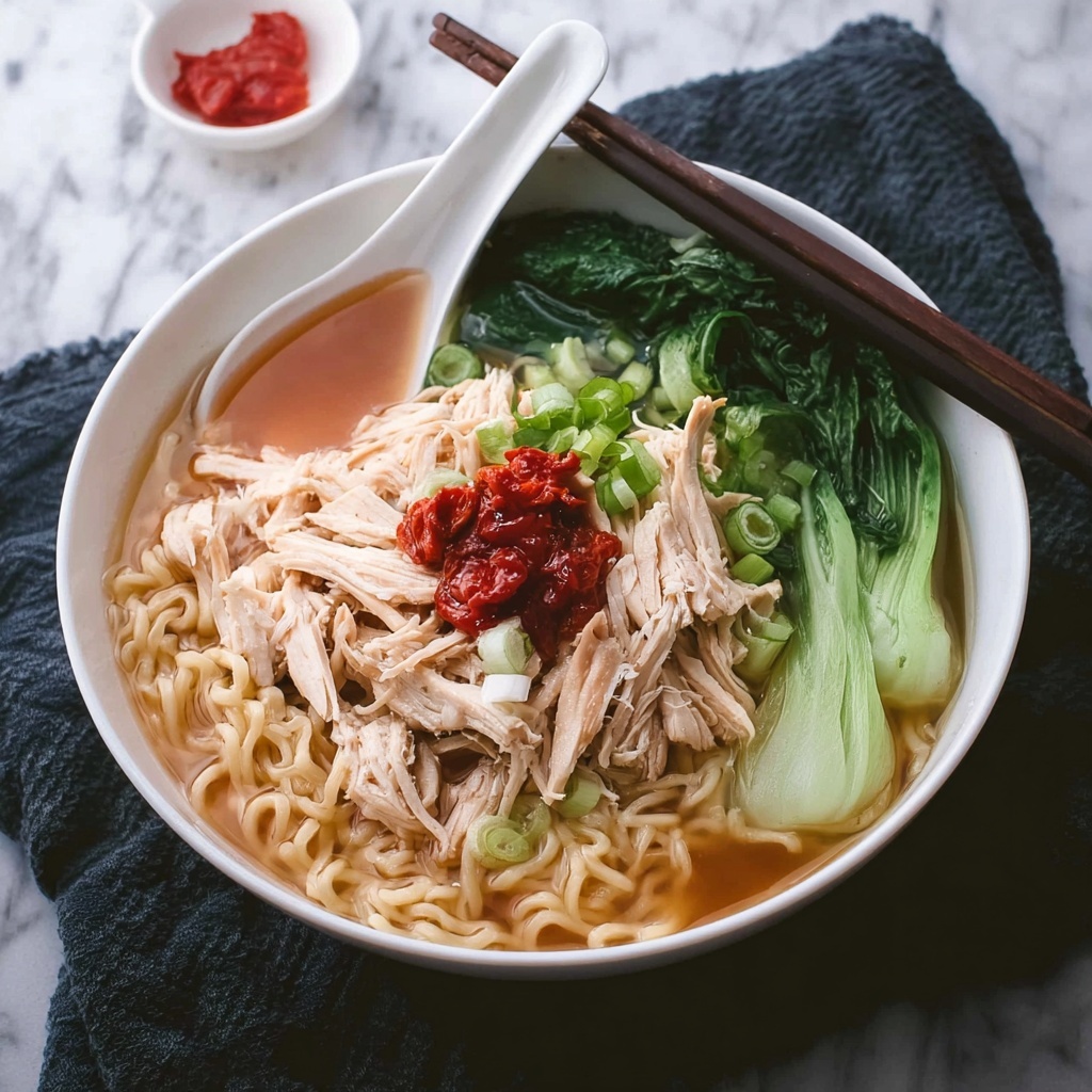 - Assemble and serve: Divide the cooked noodles into serving bowls. Top with shredded cooked chicken and the blanched bok choy. Ladle the hot broth over the ingredients and garnish with finely sliced scallions if desired. Serve alongside chili paste or fresh chillis for an extra kick.