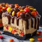 Indulge in this decadent Chocolate Peanut Butter Candy Cheesecake featuring a chocolate sandwich cookie crust, creamy peanut butter-infused cheesecake filling studded with peanut butter cups, and topped with a rich chocolate ganache. Perfect for peanut butter and chocolate lovers seeking a no-fail, creamy, and irresistible dessert.