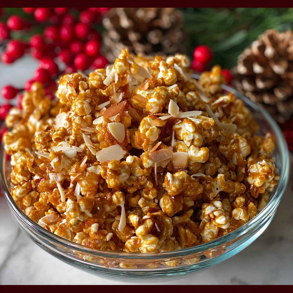 Celebrate the holiday season with this irresistible Christmas Popcorn Candy, featuring crunchy popcorn coated in a rich, spiced caramel with hints of cinnamon, ginger, allspice, and cloves. Enhanced with slivered almonds for added texture, this festive treat is perfect for sharing or gifting during Christmas gatherings.
