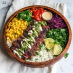 Now for the fun part—assembling your bowls! Start with a generous scoop of warm rice at the base. Layer on the black beans, sweet corn, juicy cherry tomato halves, creamy avocado slices, and the beautifully grilled steak strips. Sprinkle diced red onions and feta cheese if using, then top everything with extra chopped cilantro. Finish each bowl with a fresh lime wedge ready for squeezing just before digging in. The colors, textures, and flavors come together so beautifully you’ll want to make this again and again.