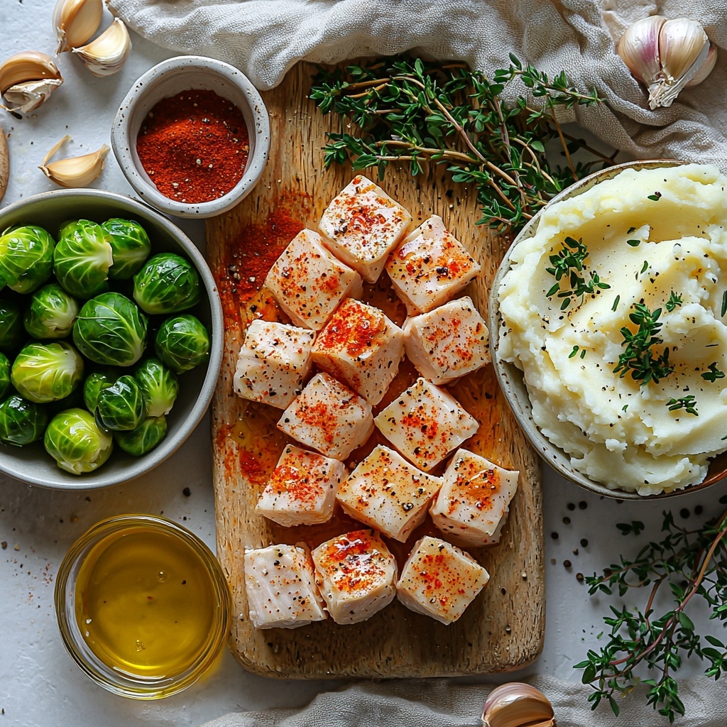 The magic of this Creamy Black Pepper Chicken Bowl with Crispy Brussels & Mashed Potatoes Recipe lies in its simple, staple ingredients, each playing a key role in building layers of flavor, texture, and color. From the vibrant green of the Brussels sprouts to the smooth decadence of heavy cream, every component is essential for that perfect balance.
