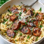 A creamy and comforting one-pan meal featuring tender orzo pasta cooked in a savory chicken broth with flavorful chicken sausage, spinach, and Parmesan cheese, perfect for a quick and satisfying dinner.