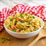 Cover the crockpot again and continue cooking for another 1 ½ to 2 hours until the noodles are tender and fully cooked through. The result is a warm, creamy noodle dish with tender chicken and vegetables nestled throughout.