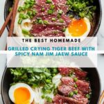 Once cooked, remove the steak and let it rest for 5 minutes. Resting allows the juices to redistribute evenly, ensuring every slice of your Crying Tiger Beef with Nam Jim Jaew Sauce Recipe is juicy and flavorful.
