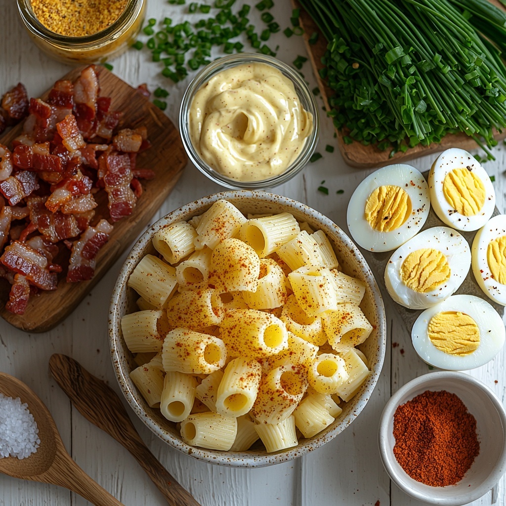 Getting this recipe right starts with simple, everyday ingredients that each bring something special to the party. From the creamy mayonnaise to the crunchy bacon, each component plays a crucial role in creating the perfect balance of flavors and textures in your Deviled Egg Pasta Salad Recipe.