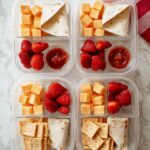 2. Divide Ingredients: Evenly portion the burritos, salsa, cheese cubes, strawberries, and Cheese-Its into 4 separate lunchboxes for balanced servings.