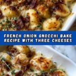 A comforting and flavorful French Onion Gnocchi Bake featuring caramelized onions simmered in broth and thyme, combined with tender gnocchi and topped with a blend of Gruyère, mozzarella, and Parmesan cheeses, then baked until golden and bubbly. Perfect for a cozy dinner.