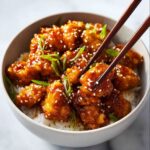 General Tso’s Chicken is a popular Chinese-American dish featuring crispy fried chicken pieces coated in a tangy, sweet, and spicy sauce. This recipe uses boneless, skinless chicken thighs marinated, dusted with cornflour, fried to perfection, and then tossed in a flavorful sauce made with soy, hoisin, chili paste, and ginger. Garnished with green onions and sesame seeds, this dish delivers the perfect balance of flavors and textures, ideal for a savory weeknight dinner or special occasion.