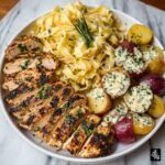 If you want to freeze portions, separate the chicken, pasta with Alfredo, and potatoes into freezer-safe bags or containers. The pesto is best kept fresh and shouldn’t be frozen because the texture and flavor can alter. Defrost overnight in the fridge for best results.