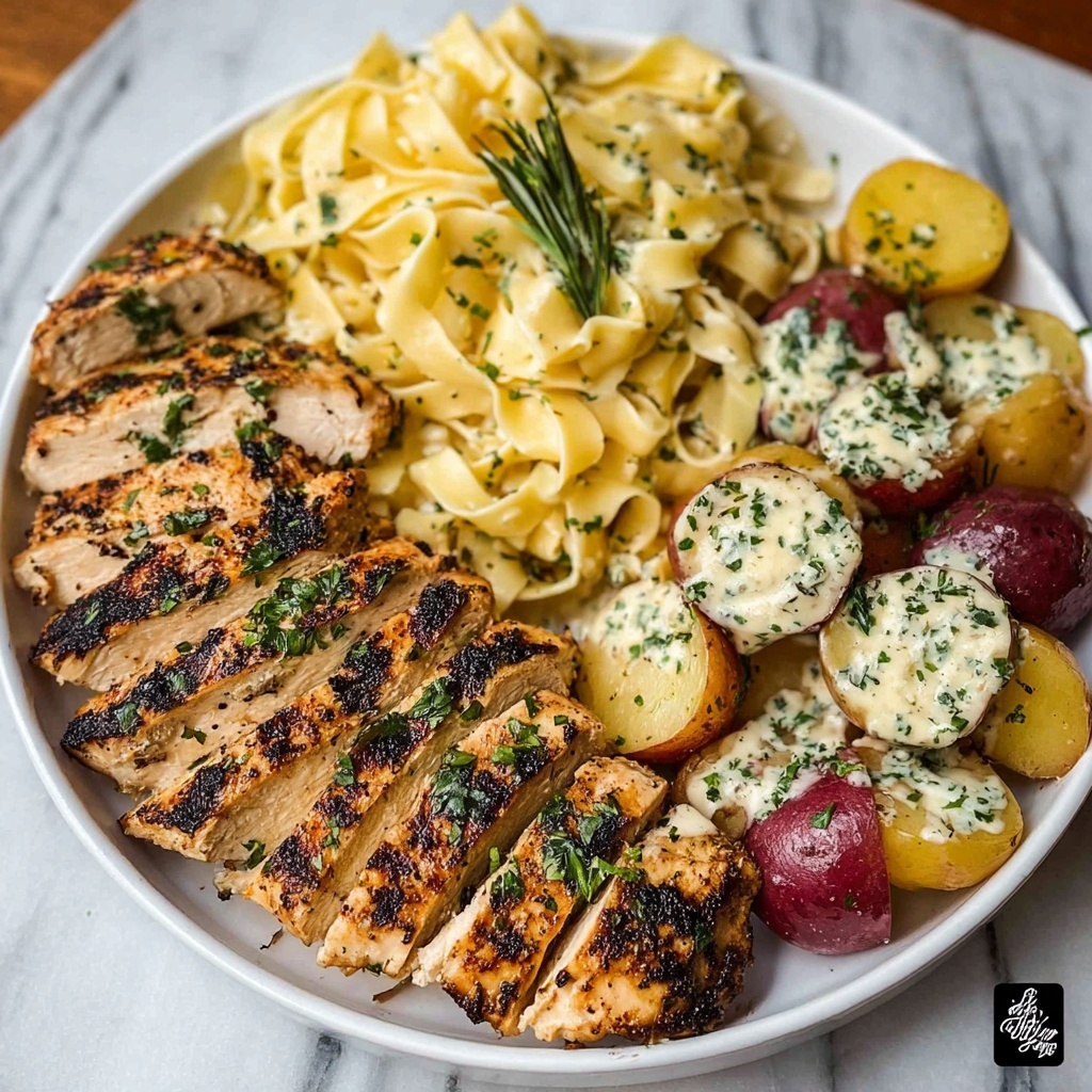 Arrange the Alfredo-coated pasta on plates, top with the grilled, sliced chicken, and then drizzle the spicy hot honey tahini pesto over the top. Serve the crisp roasted garlic potatoes on the side, and garnish the whole plate with extra fresh herbs. The colors and aromas combined will be an absolute feast for the senses.