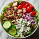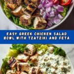 This Greek Chicken Salad Bowl with Tzatziki & Feta is a fresh, vibrant meal perfect for a quick lunch or dinner. It features tender grilled chicken marinated in aromatic herbs and lemon, served over crisp romaine lettuce, juicy cherry tomatoes, cucumber, and tangy feta, all topped with a creamy homemade tzatziki sauce made from Greek yogurt and fresh dill.