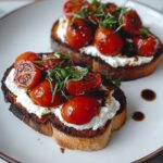 Spread a generous spoonful of whole-milk ricotta over the garlic-rubbed side of each slice. Then, top with the halved cherry tomatoes. Their juicy sweetness contrasts beautifully against the creamy ricotta and smoky bread, creating layers of taste and texture you’ll crave.