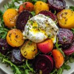 Finish by adding fresh parsley or arugula to the salad for a burst of color and a peppery bite. Serve immediately to enjoy the contrast of warm veggies and cool, silky burrata paired with the vibrant pesto — this salad is a sensory delight you’ll want to savor every bite of.