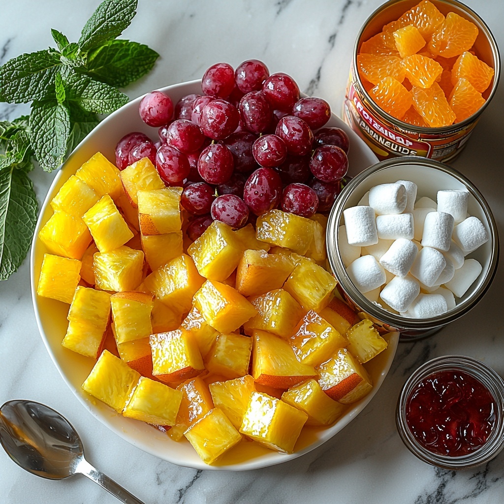 Gathering the right ingredients is half the joy of making this Hawaiian Fruit Salad Recipe. Each component plays a special role, from the juicy fruits providing vibrant color and natural sweetness to the marshmallows adding a fun, soft bite and the gelatin-sour cream mix delivering creaminess with a citrusy zing.