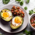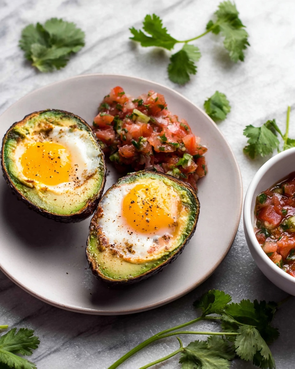 - Serve: Once baked, season the avocado halves with a pinch of salt and pepper. Serve topped with the fresh salsa and optionally include Tabasco sauce, warm refried beans, and tortillas on the side for a complete meal.