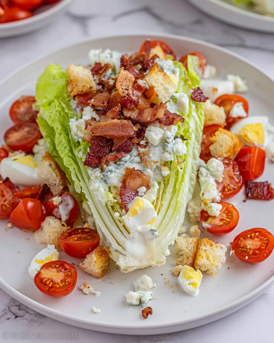 - Assemble the Salad: Place one lettuce wedge on a serving plate. Drizzle a generous amount of blue cheese or ranch dressing over the lettuce wedge. Top with quartered cherry tomatoes, chopped bacon, chopped hard-boiled eggs, croutons, and crumbled blue cheese evenly distributed over the wedge.
