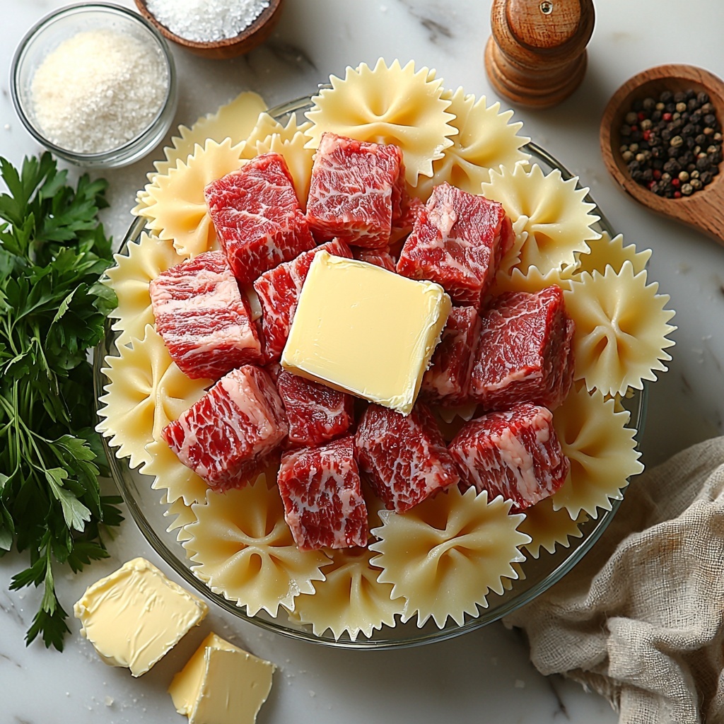 The beauty of this Indulgent Beef and Bowtie Pasta with Creamy Alfredo Bliss Recipe lies in its straightforward ingredients, each one playing an essential role in delivering luxurious flavor and satisfying textures. From the pasta’s lovely shape that holds the sauce, to the lush cream and cheese that create that signature Alfredo richness, every element has a purpose.