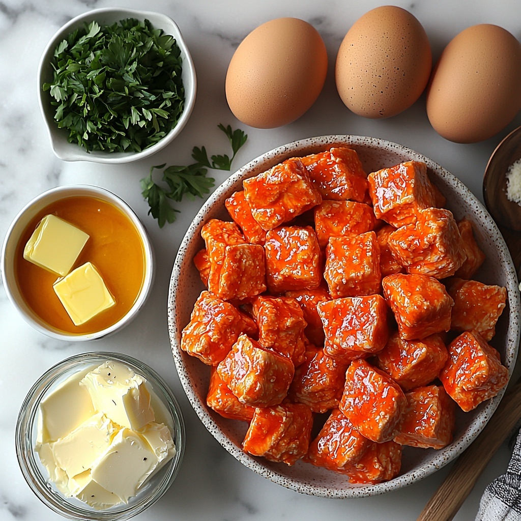 These ingredients might look basic, but each one plays a starring role in making these bites pop with flavor and crunch. From the tender chicken base to the luscious buffalo garlic sauce, everything is straightforward yet essential to create that perfect harmony of texture, spice, and creaminess.