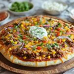 Bring the crust with the chilled creamy base out of the fridge. Now the fun begins—spread the seasoned taco meat evenly across the surface. Next, scatter the shredded cheddar and mozzarella cheeses on top to give it that ooey-gooey cheesy goodness. Add a colorful layer of diced tomatoes and finish with a handful of shredded lettuce for a fresh crunch. If you crave spice, sprinkle sliced jalapeños or chilies over everything for that bold punch.
