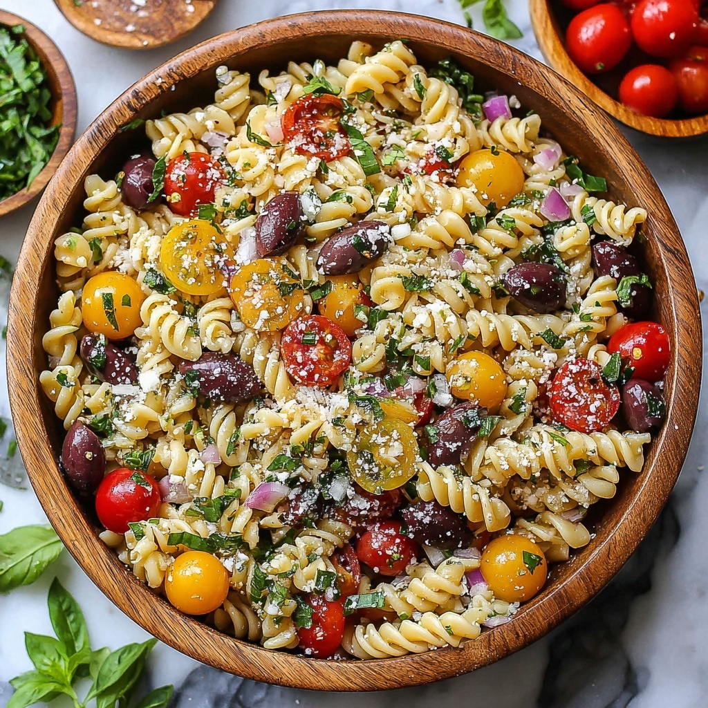 A refreshing and colorful Italian Pasta Salad featuring rotini pasta mixed with fresh cherry tomatoes, cucumber, bell peppers, red onion, and olives, all tossed in a zesty Italian dressing. Perfect as a side dish or light meal, this salad is easy to prepare and can be enjoyed chilled.