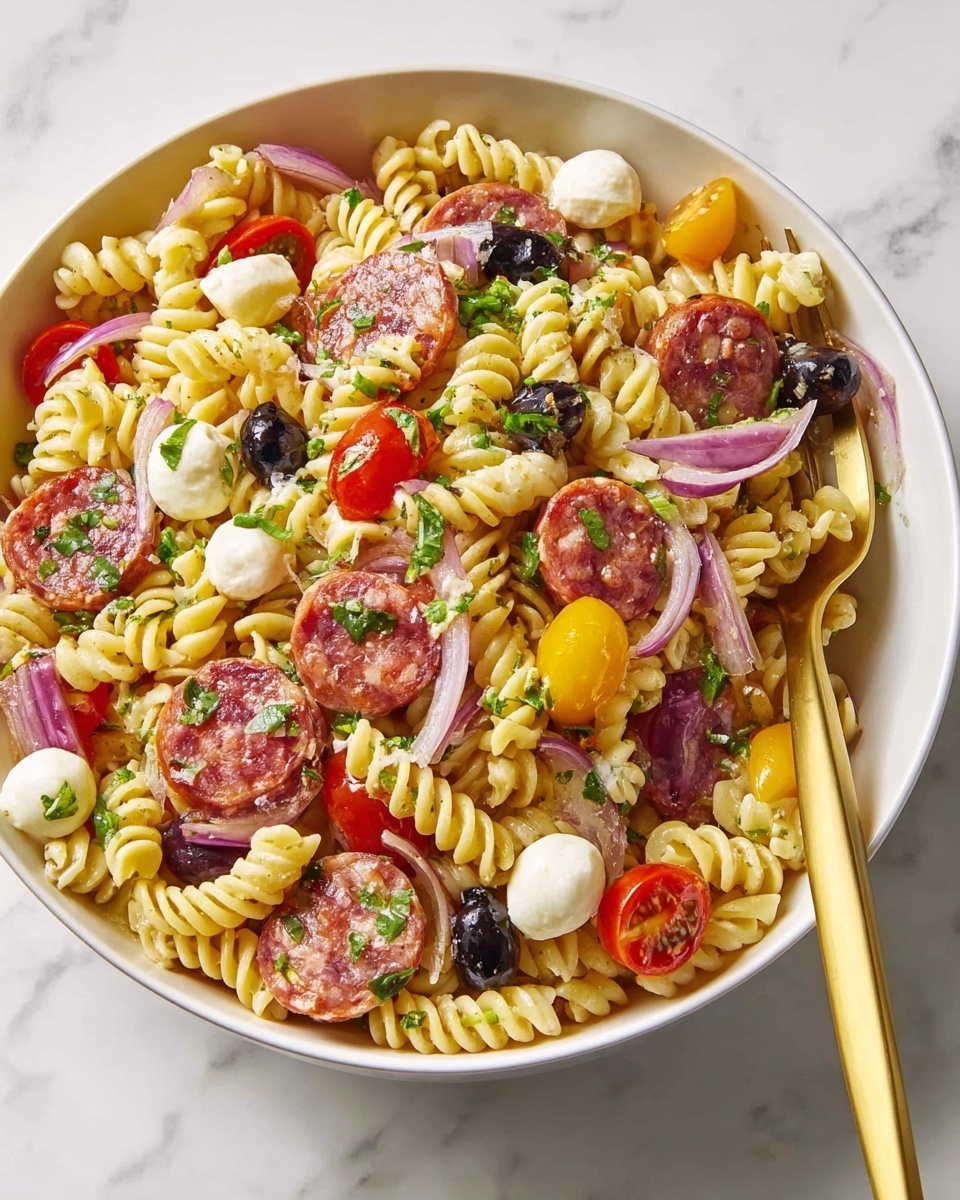 A vibrant and flavorful Italian Pasta Salad featuring rotini pasta, diced salami, fresh mozzarella, and a medley of colorful vegetables, all tossed in a zesty Italian dressing. Perfect for a quick lunch or as a side dish at gatherings, this salad combines the richness of salami and cheeses with fresh herbs and crisp veggies for a delightful and easy-to-make recipe.