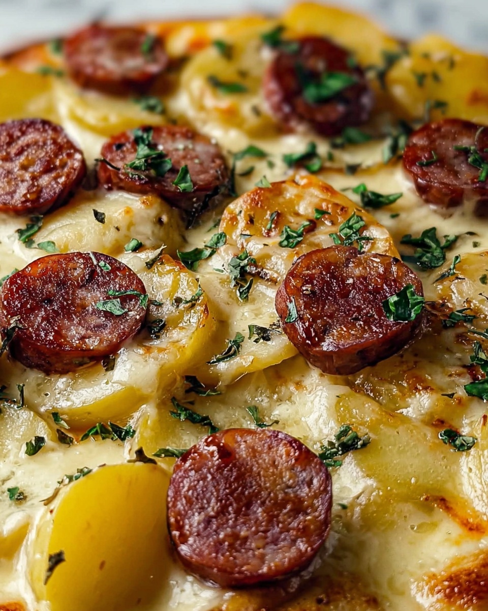 This Kielbasa Sausage Cheesy Potato Casserole is a hearty and comforting American main course dish combining savory kielbasa, tender hash browns, and melted cheddar cheese baked to bubbly perfection. Perfect for an easy dinner, it features a creamy mix of sour cream and cream of chicken soup with a hint of paprika and garlic for rich flavor, topped with fresh parsley for a bright finish.