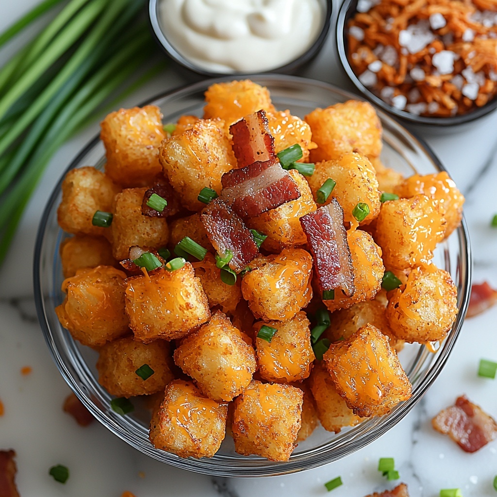 Gather all the tots onto one baking sheet. Sprinkle shredded cheddar cheese evenly over the top followed by crumbled bacon. Pop them back into the oven for about 3 to 5 minutes, or until the cheese is beautifully melted and bubbly, binding everything together.