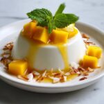 8. Serve and garnish: Before serving, garnish each panna cotta with fresh mango slices, toasted coconut flakes if using, and fresh mint leaves for a vibrant and elegant presentation.