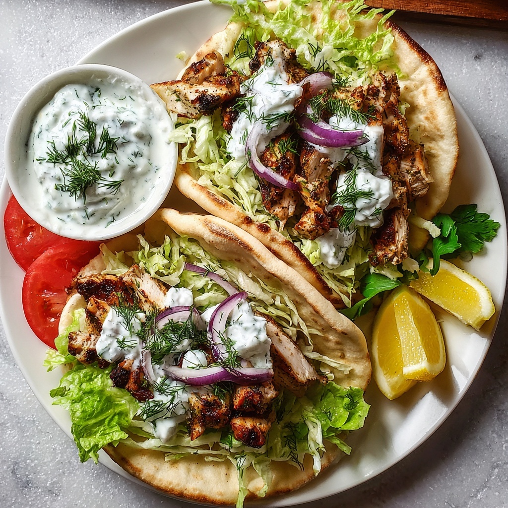 Time to bring it all together! Spread a generous spoonful of your creamy feta tzatziki on each warm pita, then layer on the sliced grilled chicken, shredded lettuce, thin slices of red onion, and juicy tomato slices. If you like, sprinkle some fresh parsley on top for that final burst of fresh herbiness.