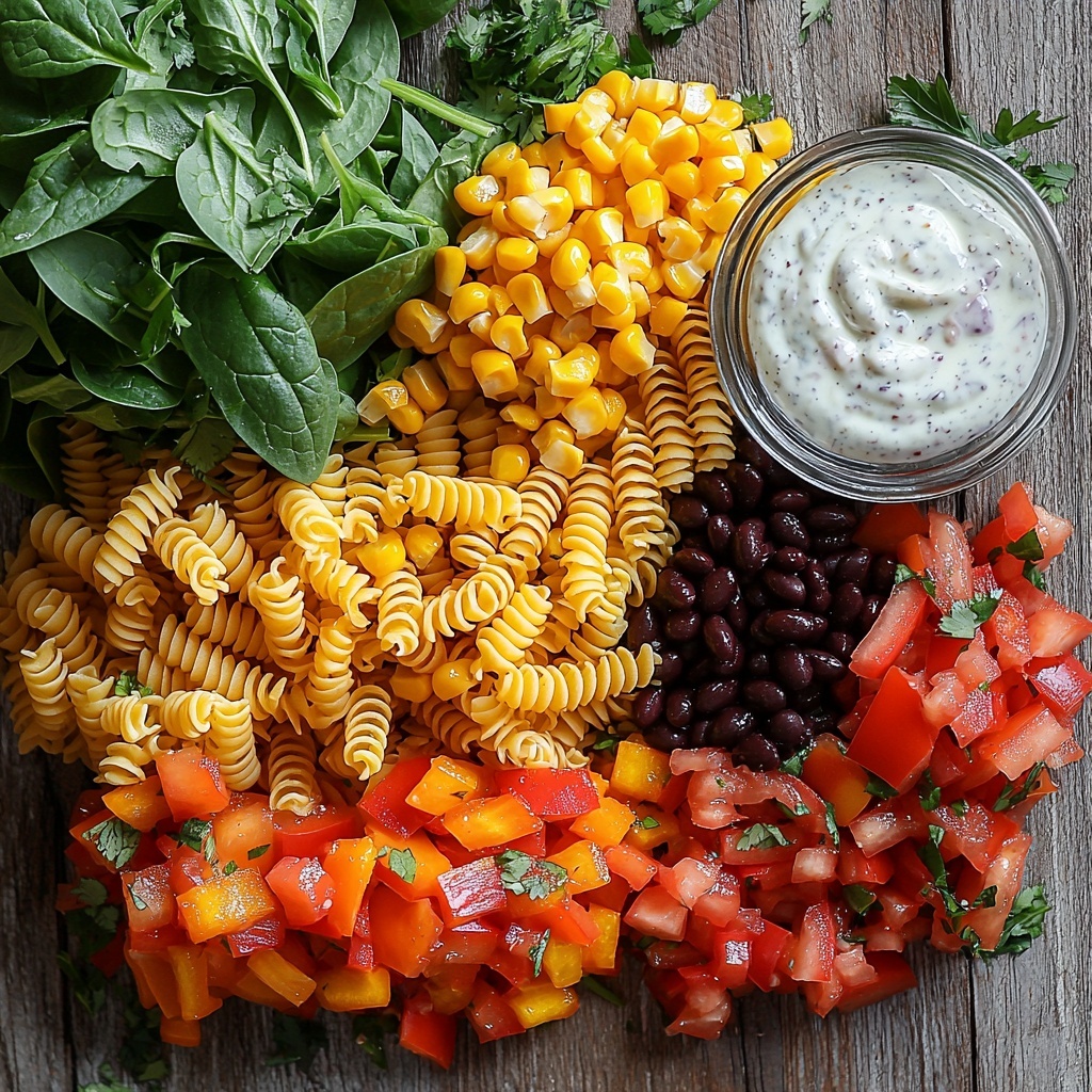 Right before serving, stir in the chopped spinach along with the remaining ranch dressing and salsa. Adding spinach at this stage keeps it vibrant and crisp, while the final dollop of dressing and salsa ensures every forkful is coated with that creamy, zesty goodness that defines this Mexican Pasta Salad Recipe.